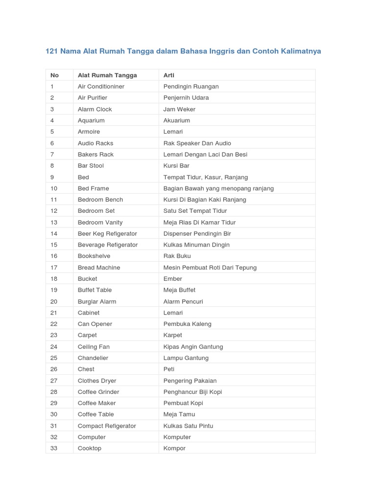 121 Nama Alat Rumah Tangga Dalam Bahasa Inggris Dan Contoh Kalimatnya Pdf